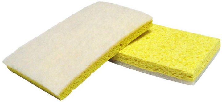 This versatile cleaning tool combines a nylon cleaning or scouring pad with an absorbent cellulose sponge
